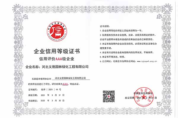 近幾年來我公司被授予2019年-2022年河北省扶貧龍頭企業、2018年國家林業標準化示范企業、2019年度全國苗圃50強、2018-2019年度河北省林業重點龍頭企業、2018年保定市精品特色現代農業園區、2018年度保定林木種苗協會授予特色苗圃、2018年度北方十佳特色苗圃、2016-2019年河北省建設工程招標投標誠實守信5A級施工企業等榮譽稱號,2017年保定市林木種苗龍頭企業、石家莊市2017年度優秀園林企業。